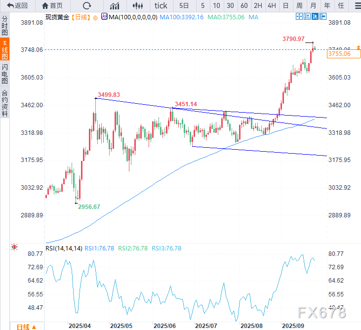现货黄金在周三(9月24日)亚市时段持稳于3755美元/盎司附近,周二金价一度升至3790.97美元/盎司,北美时段回落,现金价高位持稳。市场对美国进一步降息的预期升温以及避险资金流动为这一贵金属提供了一定支撑。