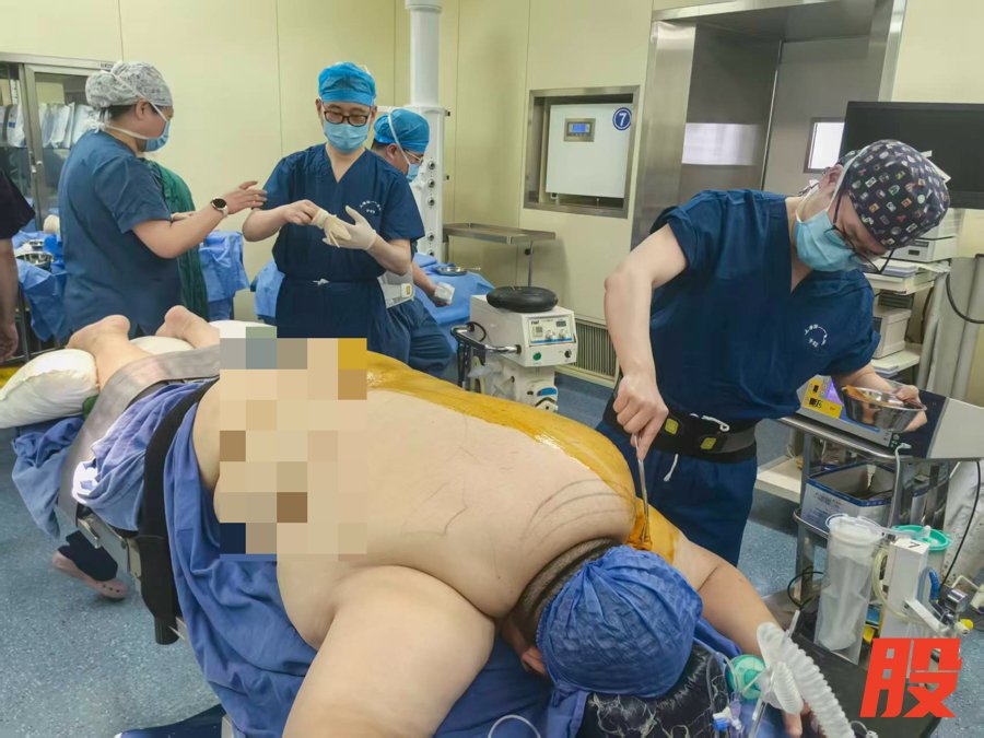 赵烨德博士带领医护团队反复研讨,制定了个性化治疗方案。该手术难度较大:一是抽脂范围广,易引发脂肪栓塞等严重并发症;二是切除面积大,存在感染、血栓等危及生命的风险。为保障手术安全,团队对小郑背部精确划分6个区域,分步开展抽吸。先对两侧腰背部外侧脂肪堆积部位注射肿胀液,待脂肪组织膨胀后,采用网格式均匀抽吸,避免皮肤凹凸不平;再以背部正中线及两侧肩胛角连线划分4个区域,逐步推进抽脂。整个过程共注射5500ml肿胀液,抽出脂肪约9000ml,7名医生分两组接力操作,有效缩短手术时间、降低风险。